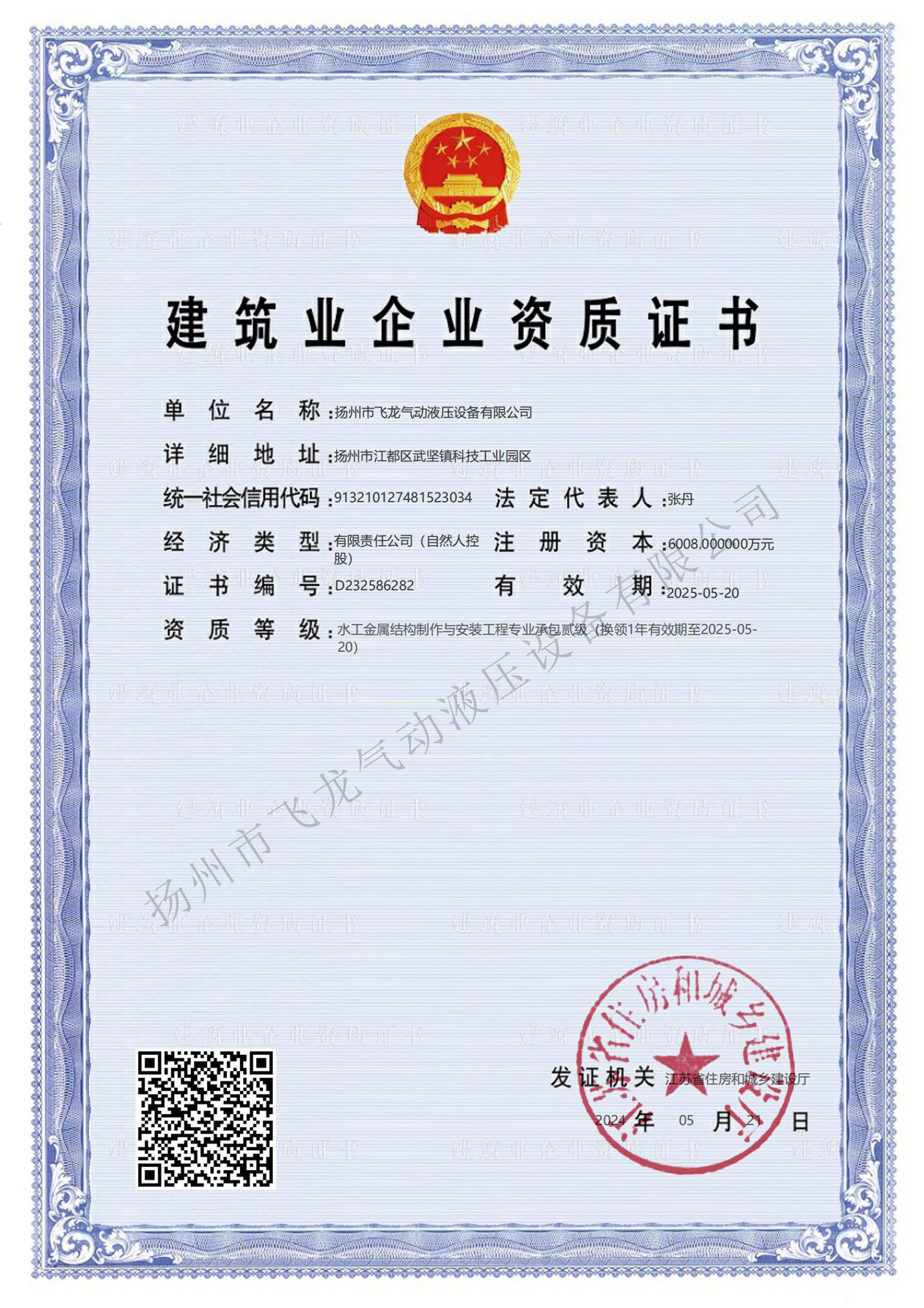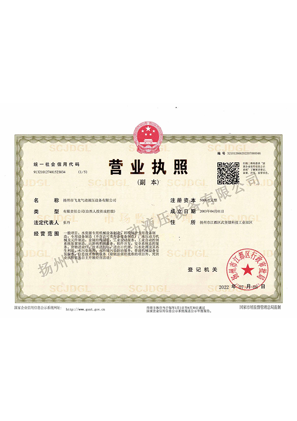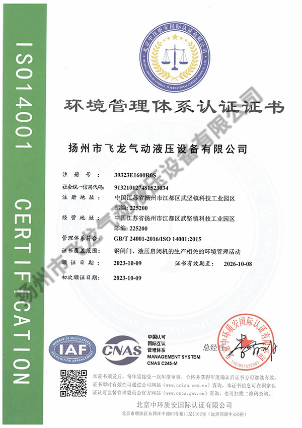 揚州市飛龍氣動液壓設備有限公司,通過ISO9001質量管理體系認證、ISO14001環境管理體系認證、OHSAS18001職業健康安全管理體系認證。公司為中國電建市政建設集團江浙生產基地、國家高新技術企業、全國水利建設市場信用AA等級、中國水利企業協會會員、銀行資信AAA等級。擁有水利部水工金屬結構防腐蝕專業施工能力證書、省住建廳安全生產許可證及水工金屬結構制作與安裝工程專業承包貳級資質。